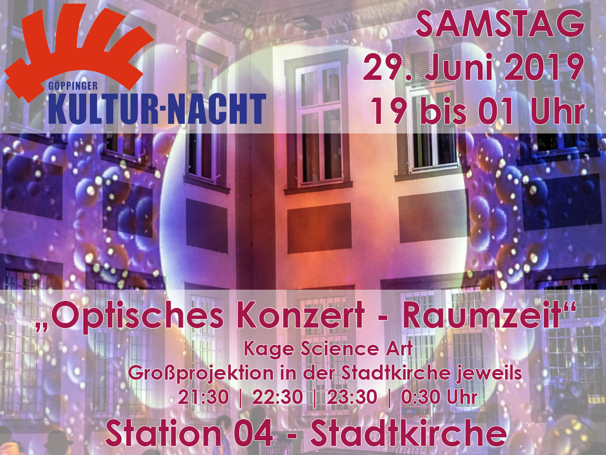 Innerhalb der Kulturnacht 2019 in Göppingen wird die Familie Kage einen Teil des Innenbereichs der Stadtkirche mit Ihrem „Optischen Konzert – Raumzeit“ bespielen. Ergänzend erfolgt eine stimmungsvolle Raumillumination. Zusammen mit weiteren Künstlern aus dem Bereich beispielsweise der künstlerischen Fotografien, der Skulpturenkunst und der Malerei, welche ebenfalls in der Stadtkirche vertreten sein werden, wird das „Optische Konzert“ in Dialog treten.